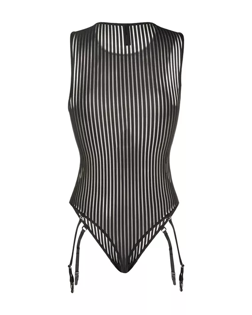 Black striped bodysuit from Maison Close featuring a round neck, a sleeveless design, a thong style, a striped pattern and suspenders.