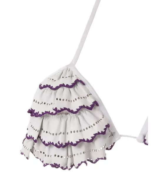 White and lilac ruffled triangle bikini set from Amir Slama featuring a triangle top with adjustable straps fo added comfort, spaghetti straps, layers of frills, decorative perforations, a back tie fastening, a brazilian style bottom, side tie fastenings, a mid-weight stretch fabric and contrasting crochet appliqués. This item fits small, please select the next size up. Swimwear must be tried on over your own garments.