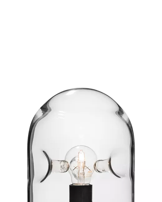 Transparent and black Tripod glass lamp from Karakter featuring a transparent design, a round top, a mouth-blown design and a EU plug.