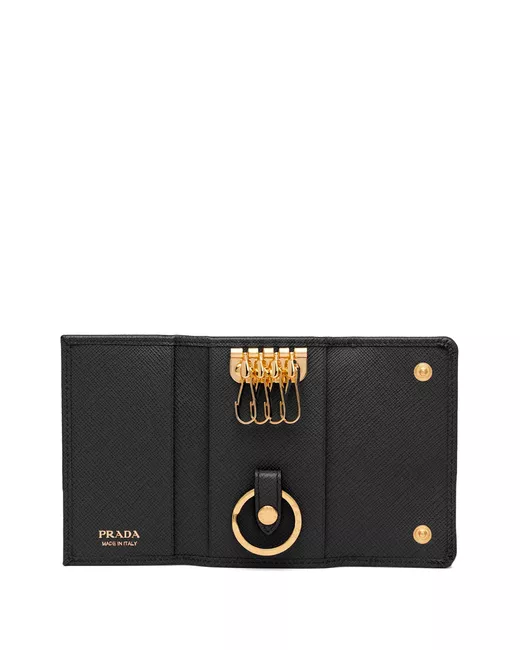 You'd lose your head if it wasn't attached. Luckily, this black leather key case will carry all those precious things you tend to lose twice a day. Thank Prada. Featuring a front logo plaque, a foldover top with snap closure, gold-tone hardware and an internal logo stamp.