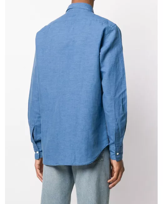 Denim blue linen-cotton blend plain button-up long sleeve shirt from Aspesi featuring a button collar, a front button fastening, a chest pocket, a curved hemline, long sleeves and button cuffs. POSITIVELY CONSCIOUS: At least 50% of the main material of this product meets our conscious criteria: for example, it's either organic, recycled, upcycled, or independently recognised as being better for the environment (such as linen, ramie, Tencel, etc.).