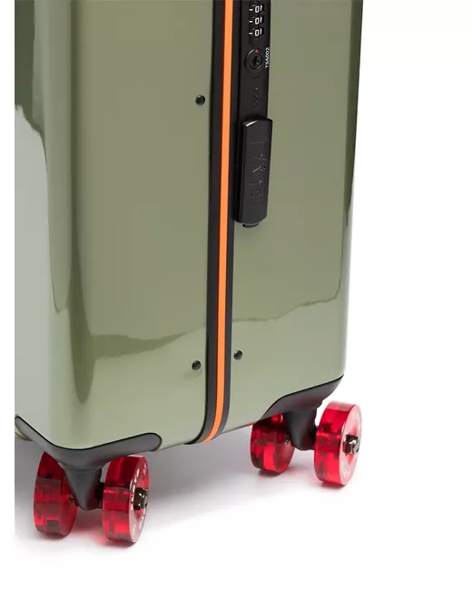 vegas green logo print to the front all-around zip fastening multiple interior compartments high-end hard shell polycarbonate durable expandable aluminium handle sticker set orange bag cover