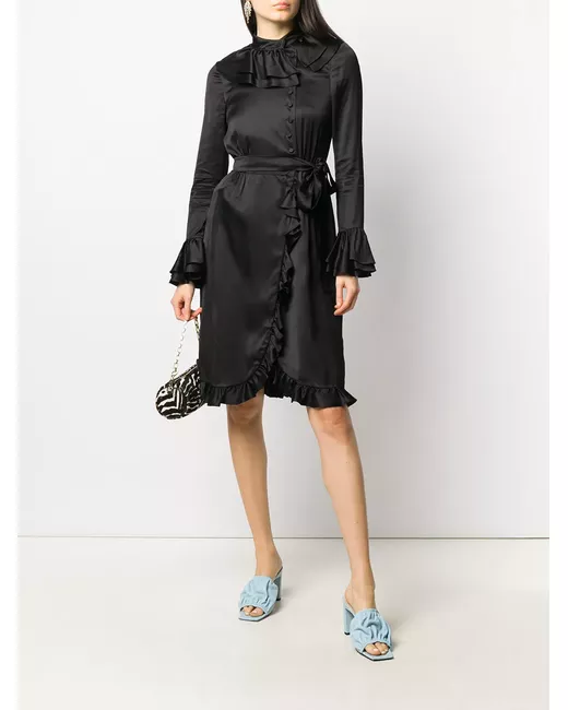 black ruffled detailing wrap design round neck long sleeves front button fastening belted waist knee-length