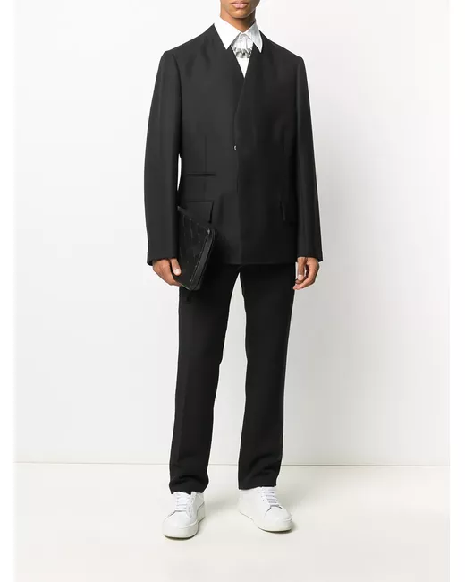 dark navy virgin wool concealed front fastening two diagonal pockets to the sides rear welt pocket slim fit frayed side bands