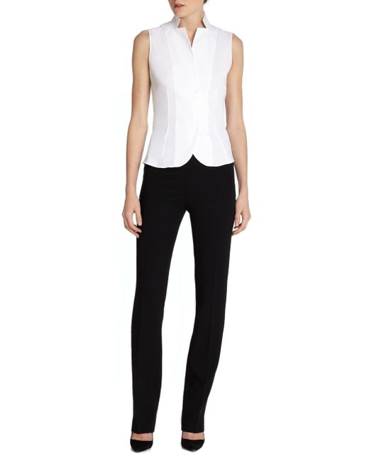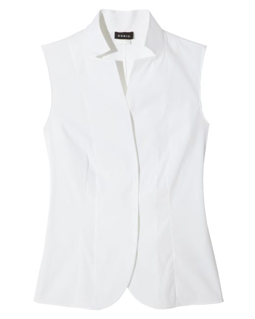 Structured silhouette blouse with precisely curved hem. Notch stand collar Concealed front button closure Sleeveless Princess seams Waist darts Curved hem Cotton/nylon/elastane Dry clean Imported SIZE & FIT About 22" from shoulder to hem ABOUT THE BRAND Founded in 1922 in St. Gallen, Switzerland, the name Akris was derived from founder Alice-Kriemler Schoch's initials. The entrepreneurial designer first started designing dotted aprons with intricate embroidery and soft cotton, which quickly grew into a full line of ready-to-wear. Almost 100 years later, the brand is now helmed by her grandsons. Creative Director Albert Kriemler continues to pay homage to his grandmother through polka-dot lined clothing, luxe fabrications and modern design-which now include sleek accessories like the cult-favorite AI trapezoidal handbag. Learn more about the Akris gift with purchase. Designer Rtw - Akris > Akris > Saks Fifth Avenue > Barneys. Akris. Color: White. Size: 16.