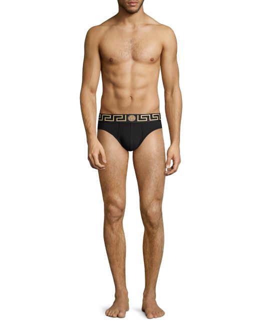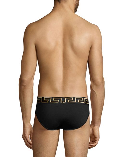 A set of two briefs with iconic logo at waistbands. Set of two Elasticized logo waistband Pull-on style Trim: Polyester/polyamide Cotton/elastane Dry clean Made in Italy ABOUT THE BRAND Founded in 1978, Versace is instantly recognizable by the signature Medusa head logo, chosen by founder Gianni Versace for its Greek symbolism. The Italian label is known for its luxe, bold clothing, sneakers, shoes and accessories-think gilding, oversized logos and punchy prints. Since taking over artistic direction, Gianni's sister Donatella Versace has maintained the brand's strong identity, with a renewed vision to give customers the ultimate freedom to express themselves. Men Accessories - Underwear > Saks Fifth Avenue > Barneys. Versace. Color: Black Gold. Size: 4 (Small).