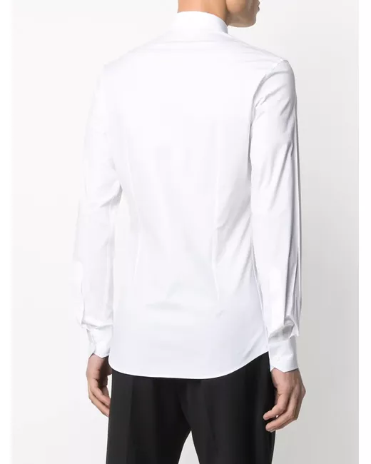 White cotton-blend Double question mark print shirt from Moschino featuring logo print at the chest, classic collar, front button fastening, long sleeves, buttoned cuffs and curved hem.