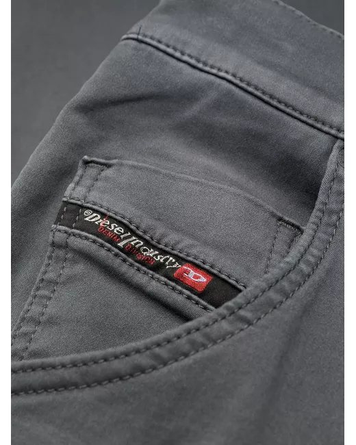 cement grey stretch-cotton tapered drawstring jeans from DIESEL featuring belt loops, classic five pockets, logo patch to the rear, drawstring fastening waist, tapered fit and zip fly fastening.