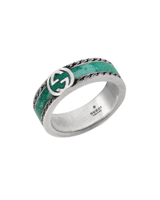 Interlocking g sterling silver 6mm enamel turquoise ring. Sterling silver Made in Italy ABOUT THE BRAND First launched in 1921 by Guccio Gucci, the Italian luxury fashion house quickly became known for its fine leather craftsmanship and accessories. Under the helm of Creative Director Alessandro Michele since 2015, the brand's opulent designs include shoes, clothing and accessories-often boasting the iconic horsebit motif. Men Accessories - Jewelry > Gucci > Saks Fifth Avenue > Barneys. Gucci. Color: Silver. Size: 8.25.