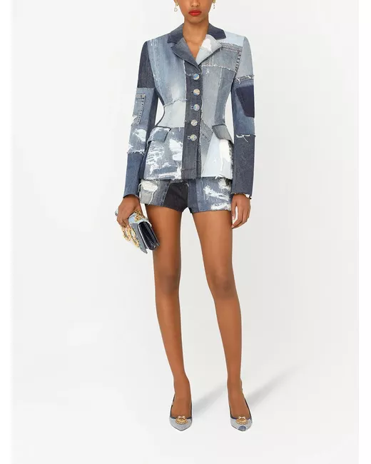 blue stretch-cotton patchwork design distressed effect front button fastening belt loops two rear patch pockets short-length Any differences between the piece pictured and the one you receive are symbols of its premium craftsmanship, quality and uniqueness.