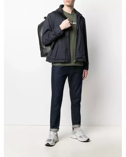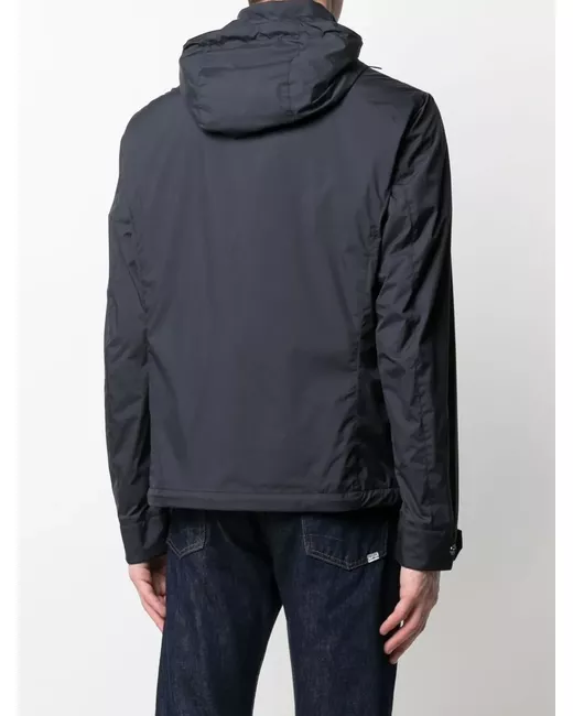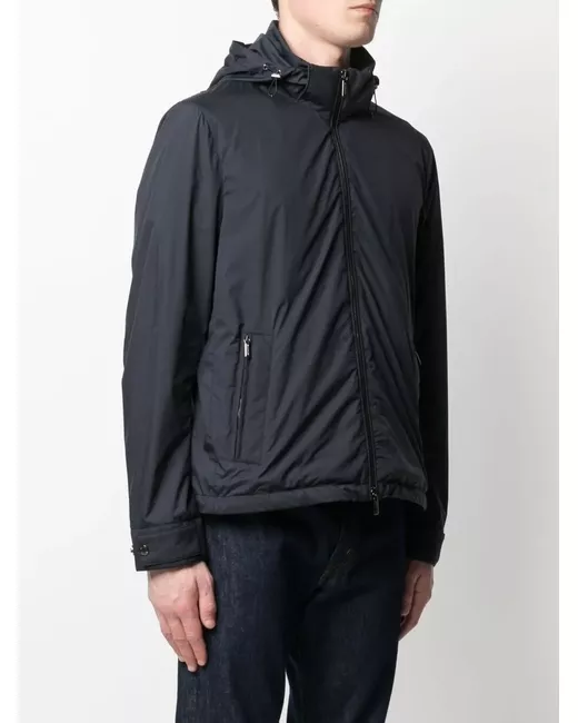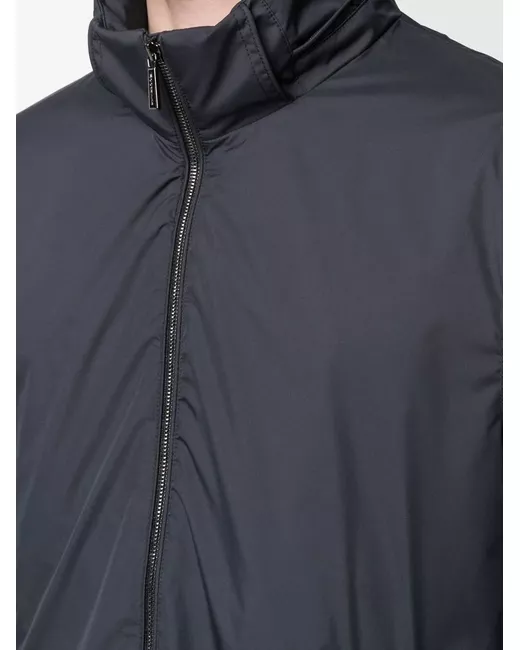 navy blue concealed hood high neck snap button-fastening cuffs front two-way zip fastening long sleeves two side zip-fastening pockets straight hem