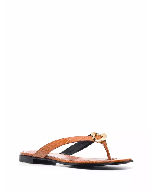 Tan-brown calf leather G Chain flat sandals from GIVENCHY featuring chain-link detailing, gold-tone hardware, crocodile effect, open toe, round toe, branded leather insole and flat leather sole.