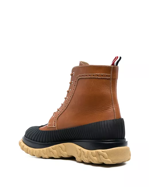 camel brown calf leather round toe front lace-up fastening perforated detailing RWB stripe tab to the heel oversize rubber sole