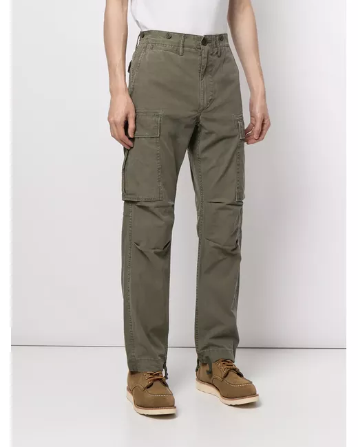 olive green cotton belt loops front button and zip fastening two side inset pockets two side cargo pockets two rear flap pockets