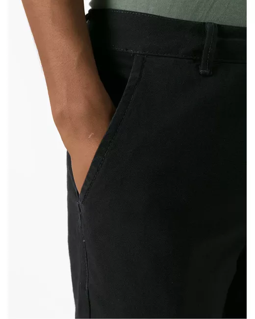 black cotton slim cut belt loops front button and zip fastening two side inset pockets two rear welt pockets