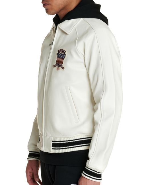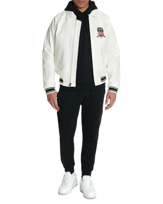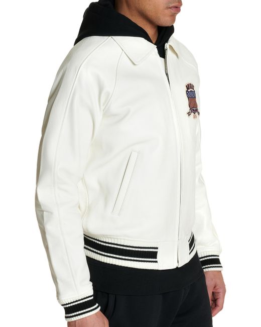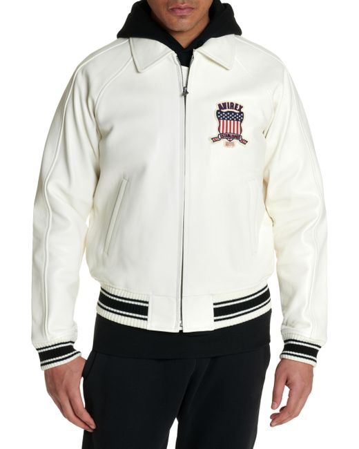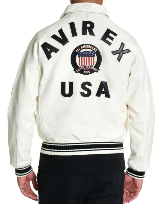 Inspired by the original A1 bomber, this jacket features a varsity style with a chest patch and spread collar. Spread collar Zip-front closure Side slip pockets Long sleeves Ribbed cuffs & hem Leather Dry clean Imported SIZE & FIT About 17.5" from shoulder to hem. Men Adv Contemp - Contemporary Outerwear > Saks Fifth Avenue > Barneys. Avirex. Color: Snow White. Size: XL.