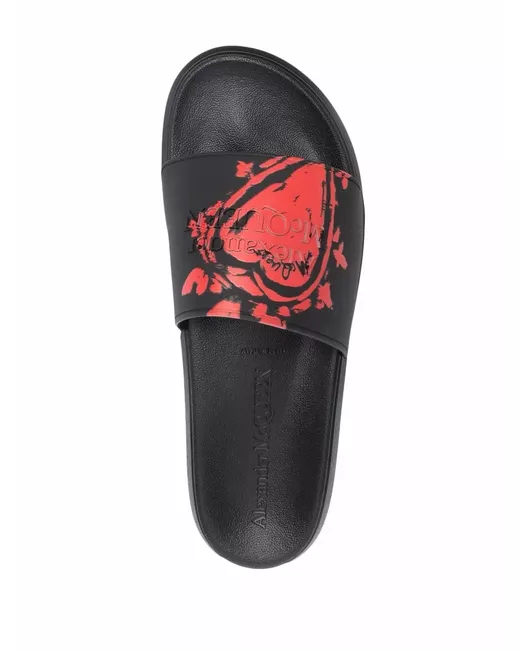 black open toe slip-on style flat rubber sole embossed logo to the front