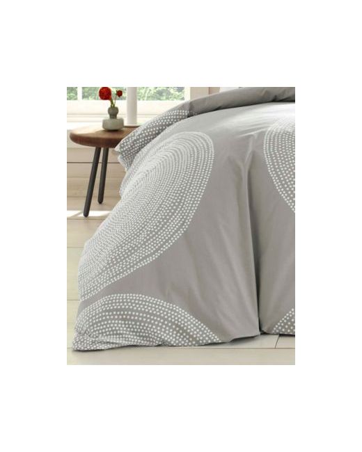 Concentric rings of small white dots join to form larger circles on a medium grey ground creating a timeless graphic that looks as modern today as it did when it was originally designed in 1999.
