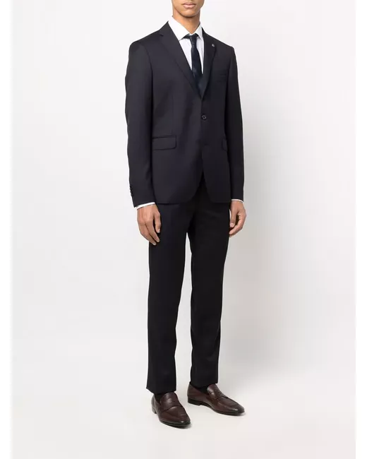 dark blue cotton/virgin wool Blazer: classic lapels front button fastening long sleeves chest welt pocket two front flap pockets Trousers: belt loops concealed front fastening two side inset pockets two rear welt pockets