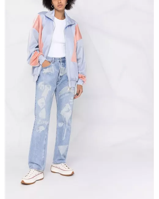 purple/blue colour-block design cutaway collar two side inset pockets front zip fastening long sleeves