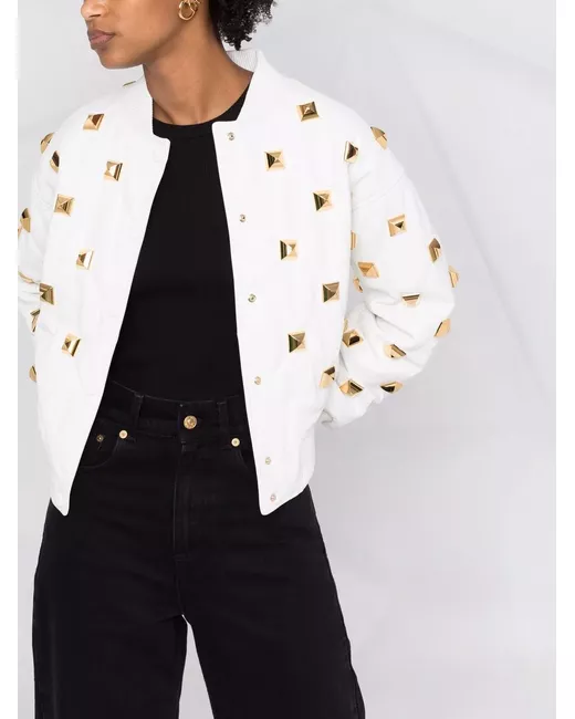white lamb skin quilted gold-tone stud detailing band collar long sleeves front button fastening