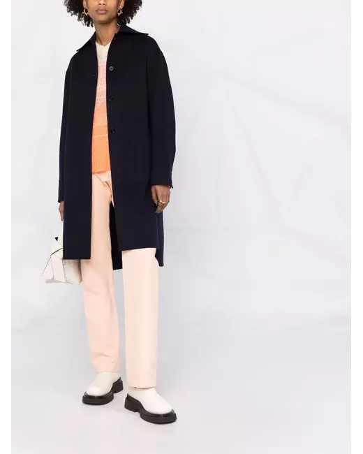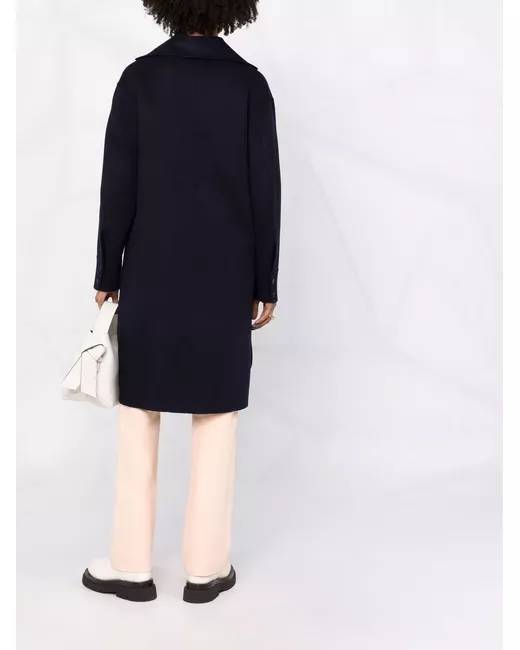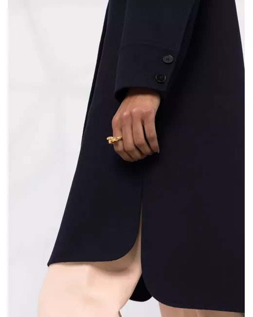 blue stretch cashmere front button fastening long sleeves two front patch pockets long sleeves buttoned cuffs curved hem