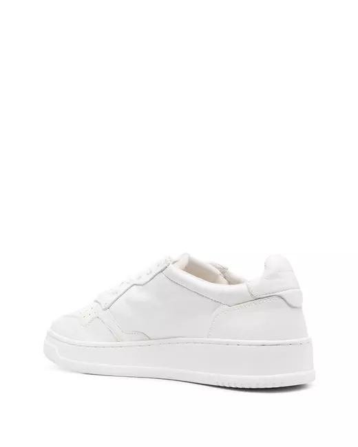 white calf leather logo patch to the side perforated detailing round to round toe front lace-up fastening branded insole flat rubber sole