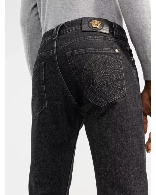 black cotton blend belt loops classic five pockets Medusa Head motif tapered leg