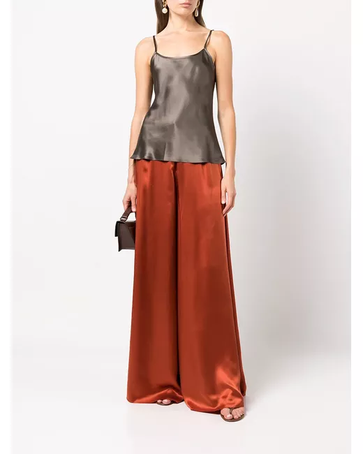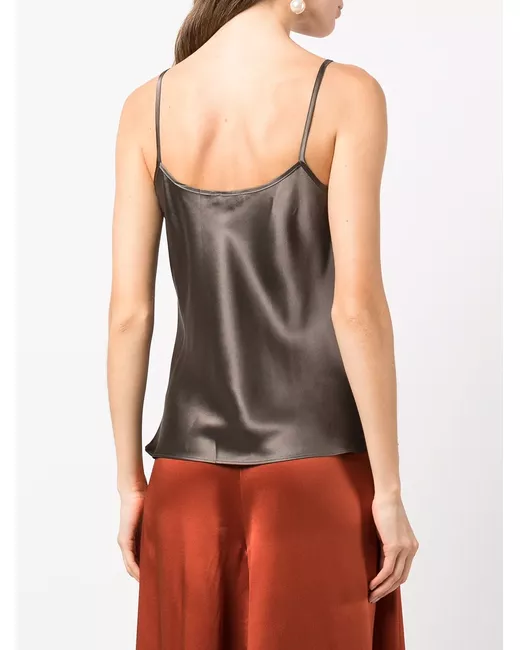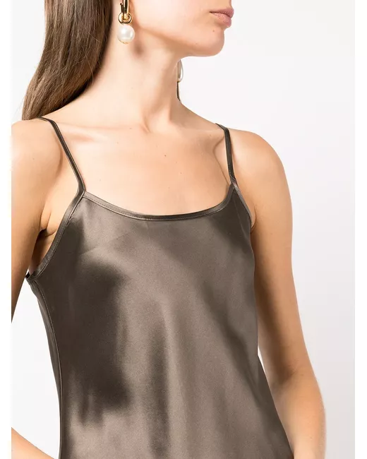 mink grey silk high-shine finish flared hem scoop neck scoop back spaghetti straps sleeveless straight hem