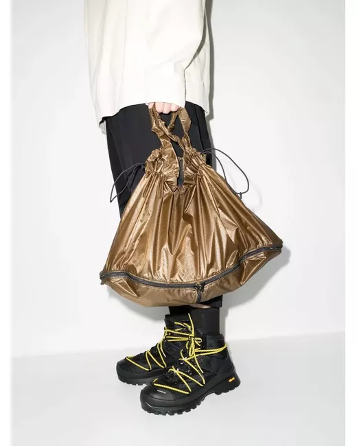 logo-print hooded performance jacket from Undercover featuring khaki, logo print to the front, logo print to the rear, panelled design, classic hood, front zip fastening, long sleeves, two side zip-fastening pockets and outer pack-away pocket.