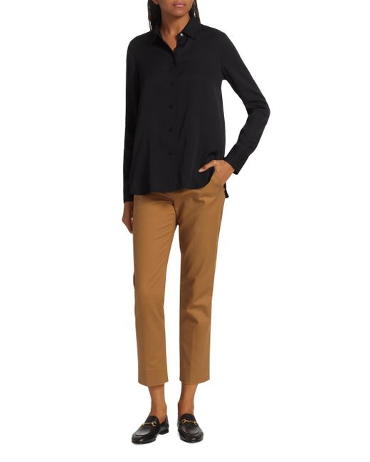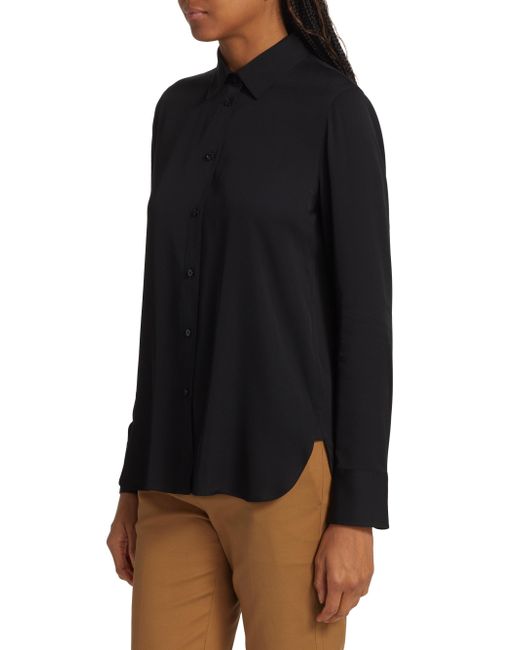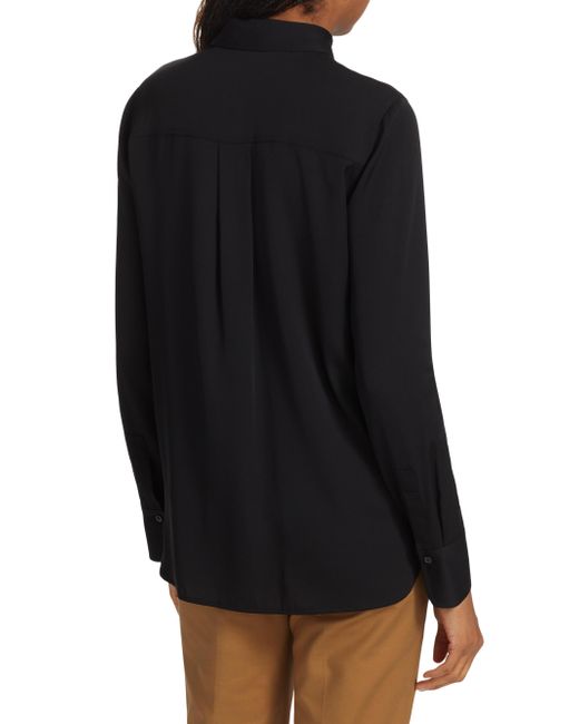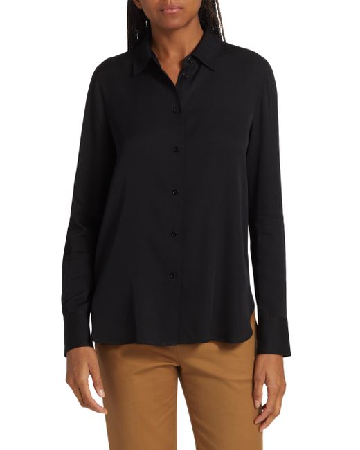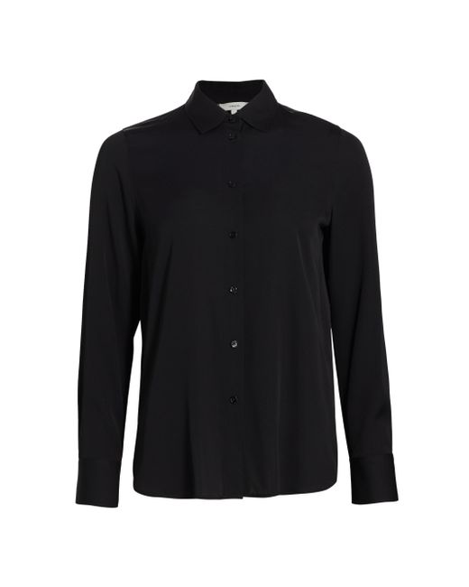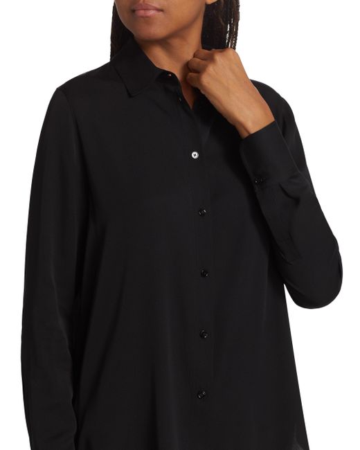 Crafted of a silk blend, Vince's blouse is designed with a point collar, button-front closure, and shirttail hem. Point collar Long sleeves Button-front closure Shirttail hem 92% silk/8% spandex Hand wash Imported SIZE & FIT Slim fit About 26" from shoulder to hem Model measurements: 5'10" tall Model is wearing US size Small. Contemporary Sportswear - Vince > Vince > Saks Fifth Avenue > Barneys. Vince. Color: Black. Size: XS.
