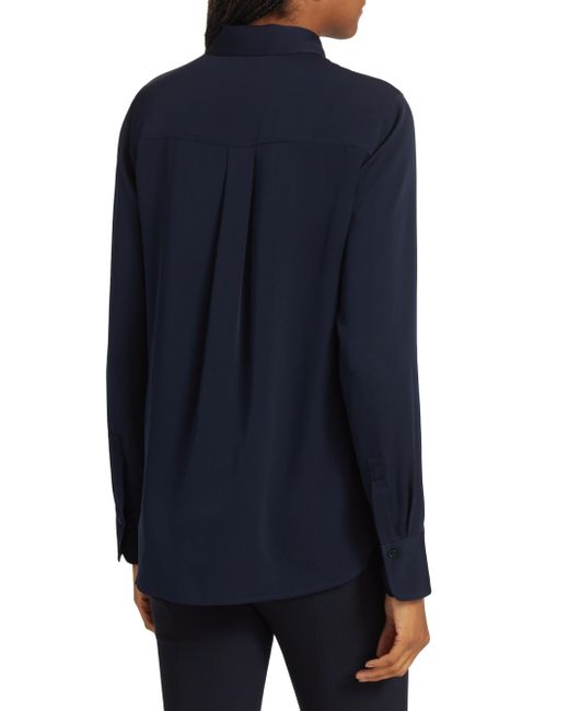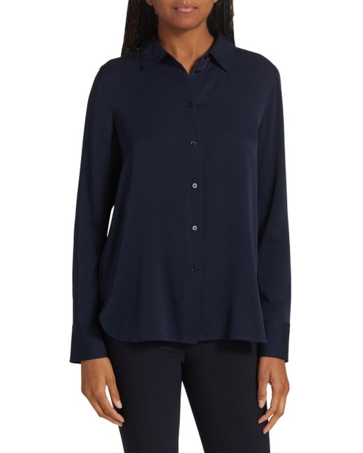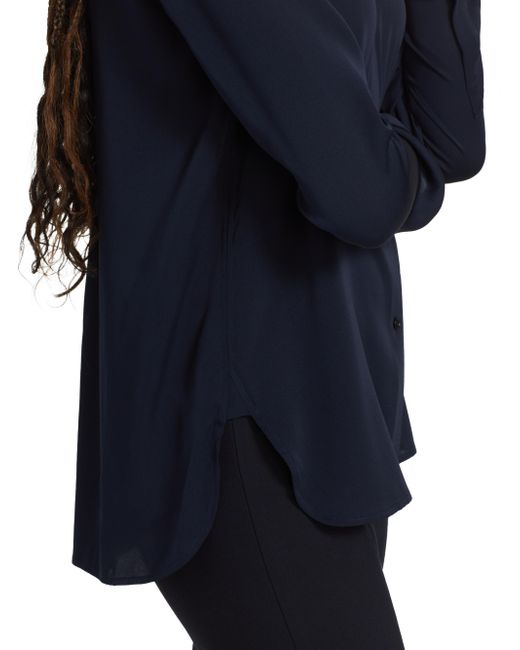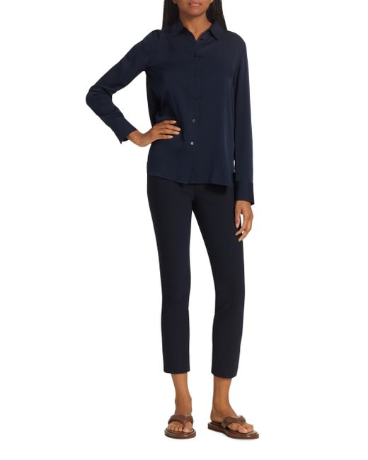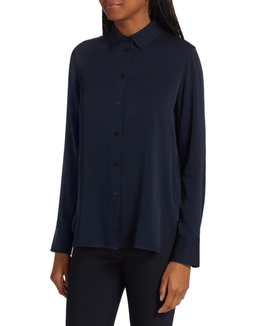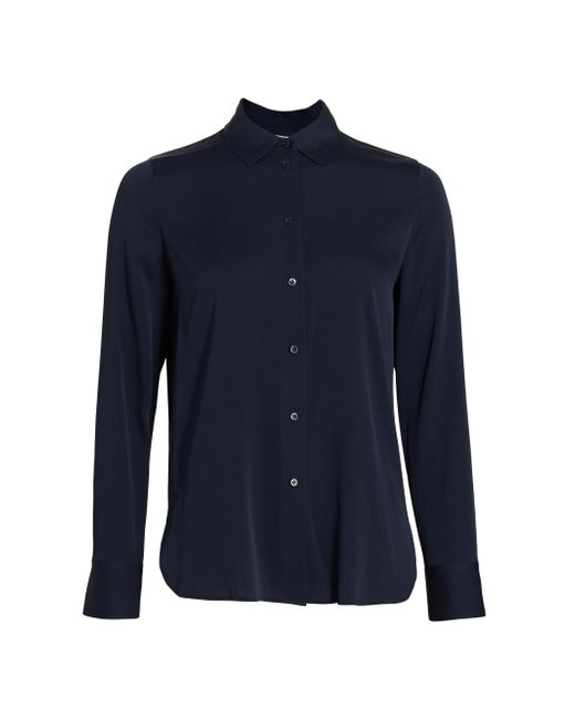Crafted of a silk blend, Vince's blouse is designed with a point collar, button-front closure, and shirttail hem. Point collar Long sleeves Button-front closure Shirttail hem 92% silk/8% spandex Hand wash Imported SIZE & FIT Slim fit About 26" from shoulder to hem Model measurements: 5'10" tall Model is wearing US size Small. Contemporary Sportswear - Vince > Vince > Saks Fifth Avenue > Barneys. Vince. Color: Coastal. Size: XXS.