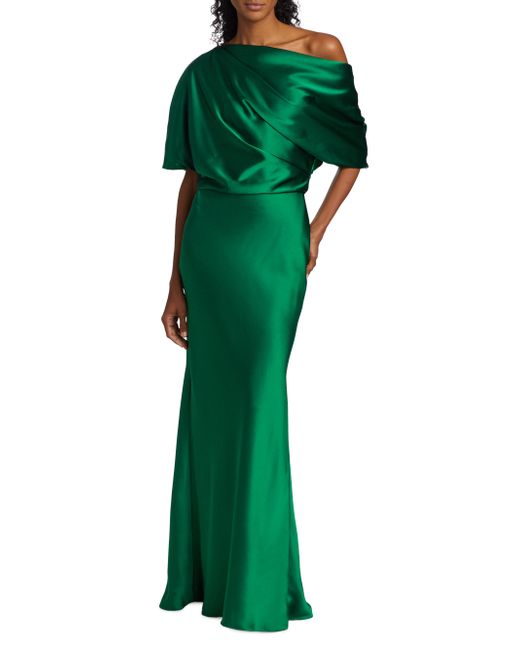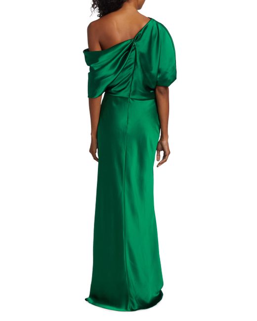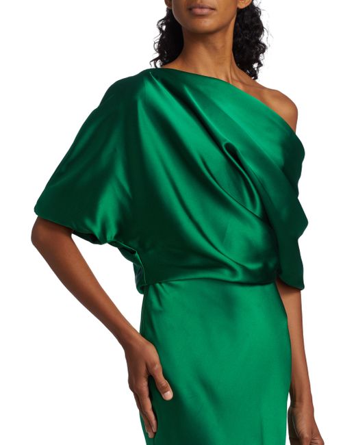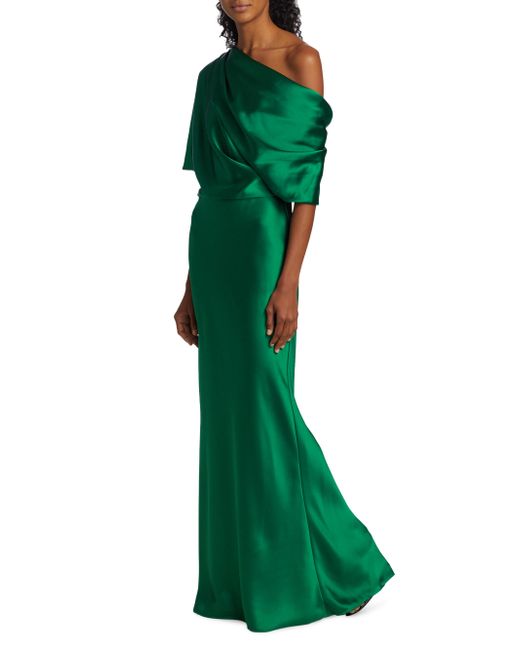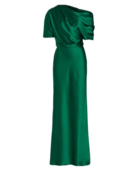 This one-shoulder gown is made from fluid satin with a draped bodice and column skirt. One-shoulder neck Draped bodice Back zipper closure 100% polyester Dry clean Imported SIZE & FIT About 61.5" from shoulder to hem Model measurements: 5'10" tall Model is wearing a US size 4. Dress Collections - Modern Evening > Amsale > Saks Fifth Avenue > Barneys. Amsale. Color: Emerald. Size: 8.