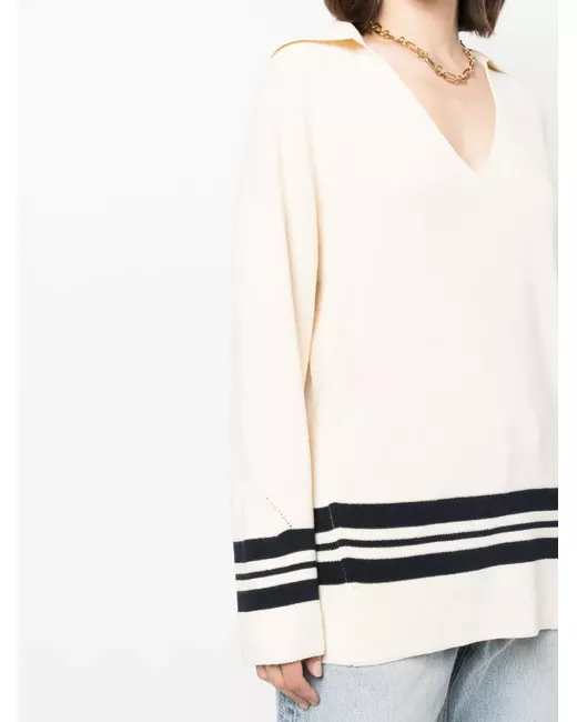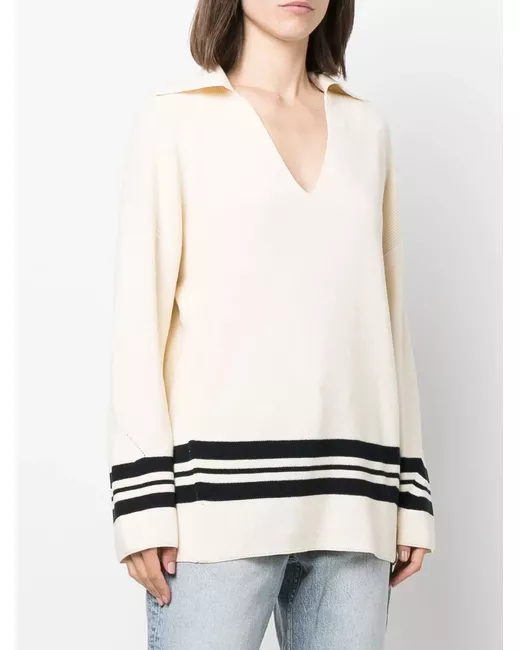 ivory white/black cotton blend stripe trim V-neck spread collar long sleeves straight hem