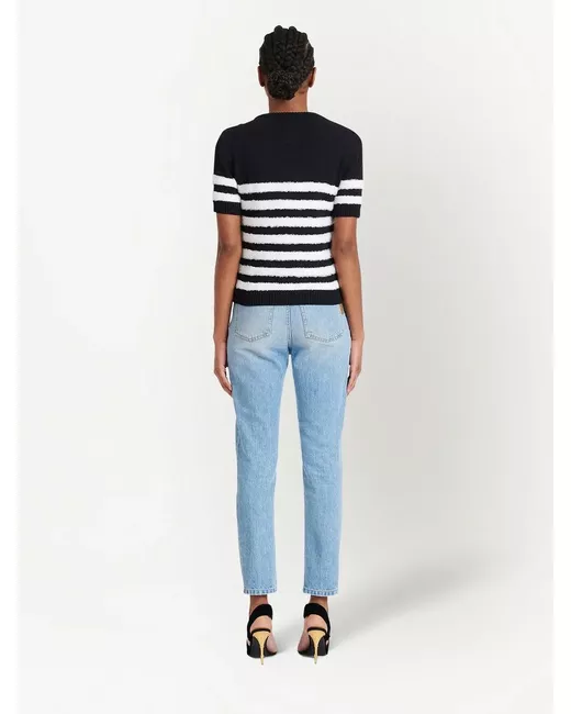 Black/white wool blend striped pattern short-sleeve top from Balmain featuring round neck, ribbed-knit edge, horizontal stripe pattern, straight hem, decorative button detailing and short sleeves.
