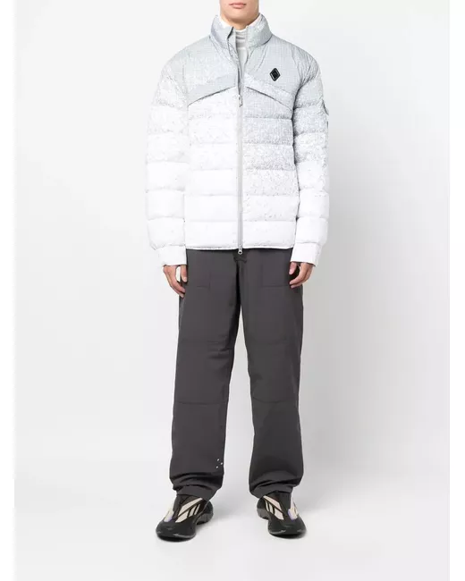 logo padded jacket from A-COLD-WALL* featuring light grey, feather down, logo patch at the chest, padded design, round neck, front zip fastening and long sleeves.