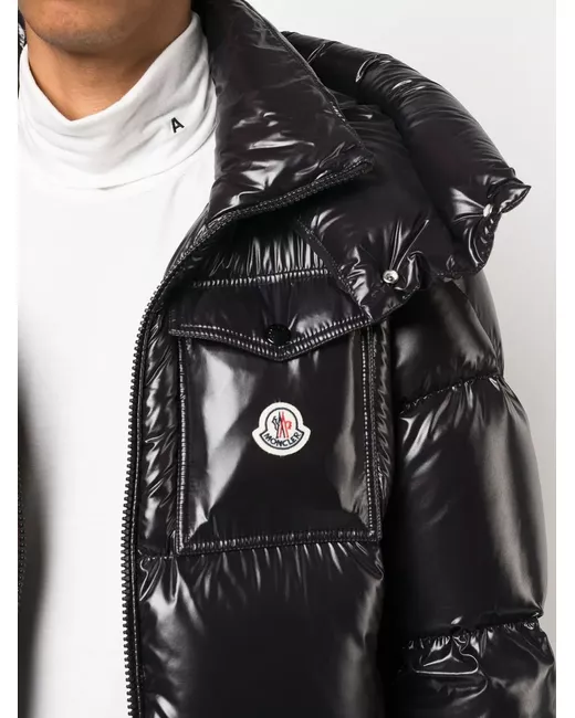 black feather down high-shine finish padded design logo patch at the chest classic hood chest patch pocket long sleeves concealed front fastening
