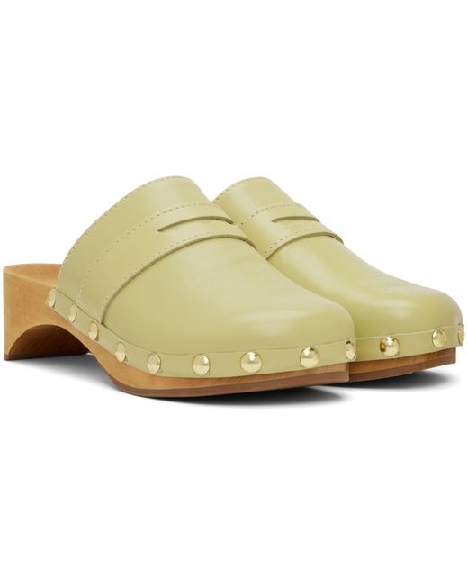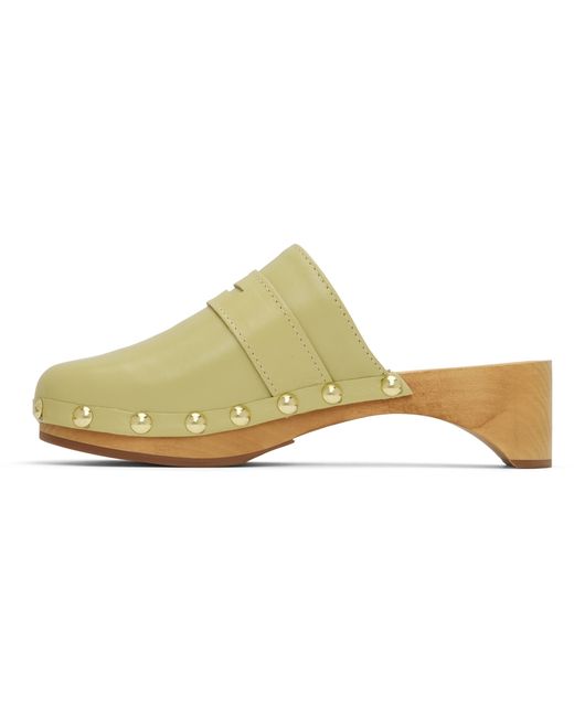 Grained lambskin slip-on loafers in green. · Leather strap with cutout at vamp · Logo engraved at footbed · Stud hardware at welt · Wood block heel and midsole · Rubber outsole · Heel: H2 in Supplier color: Olive