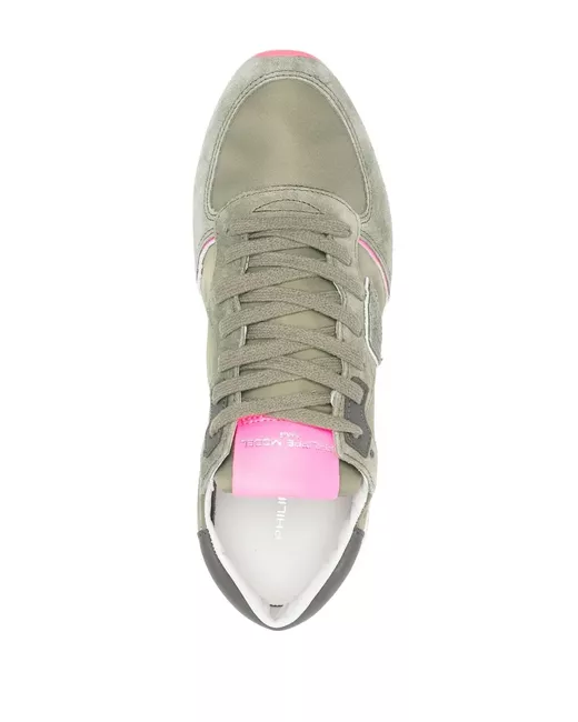 olive green/fuchsia pink suede panelling front lace-up fastening appliqué logo logo patch at the tongue branded heel counter ridged rubber sole