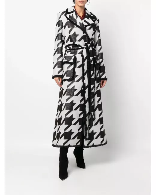 houndstooth-print belted coat from PHILIPP PLEIN featuring black/white, houndstooth pattern, frayed detailing, appliqué logo, notched collar, belted waist, long sleeves, two front flap pockets and straight hem.