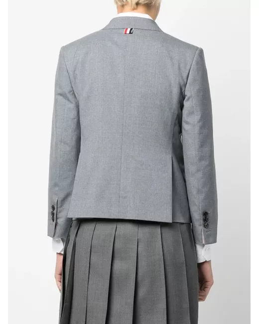 grey wool blend notched lapels chest welt pocket button fastening two front flap pockets cropped three-quarter length sleeves buttoned cuffs English rear vents