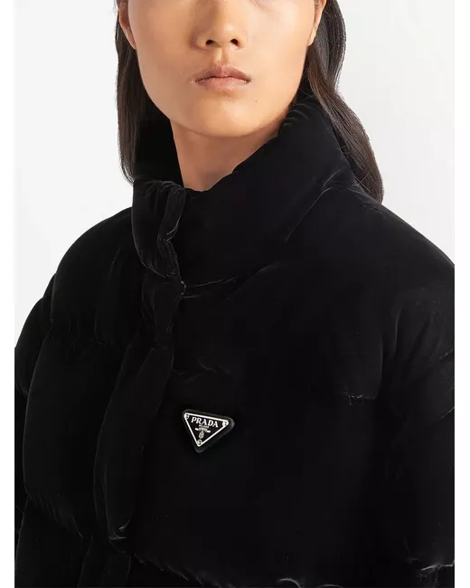 detachable-sleeve cropped puffer jacket from PRADA featuring black, recycled nylon, velvet, down-feather filling, padded design, detachable sleeves, silver-tone hardware, enamel triangle logo, high neck, front press-stud and zip fastening, long sleeves, elasticated cuffs, drawstring hem, cropped and two front welt pockets. .