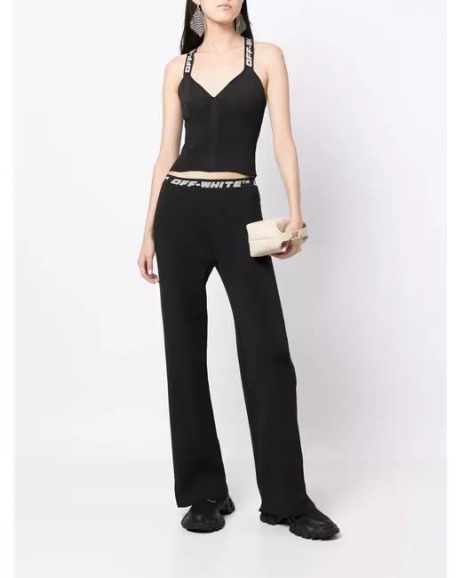 black stretch-design knitted construction logo shoulder strap logo-tape detailing cross shoulder straps V-neck cropped ribbed-knit edge