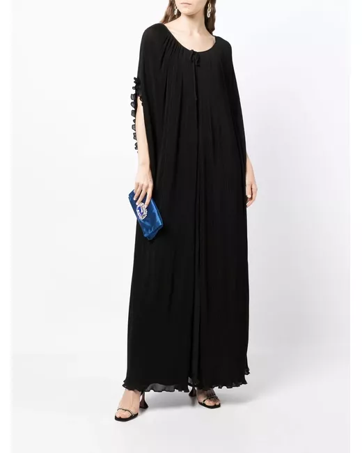 black Dress: square neck thin shoulder straps pleat detailing long length Cape: fine ribbed short slit sleeves front tie fastening lettuce hem