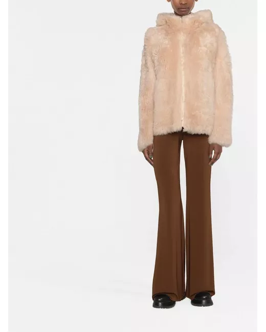 zip-up shearling coat from YVES SALOMON featuring light beige, lambskin, shearling, shearling trim, slouchy hood, front zip fastening, long sleeves and straight hem.