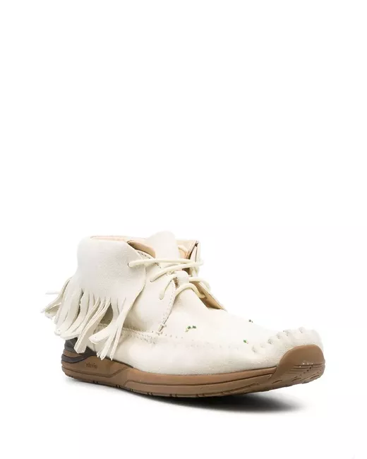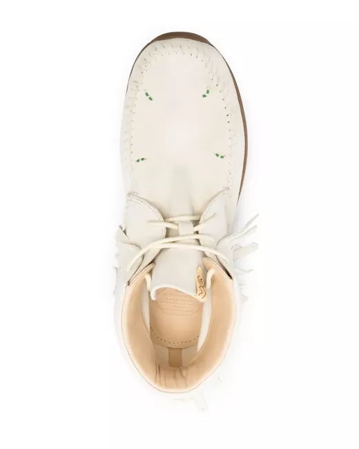 ivory white calf leather contrast stitching fringed edge square toe front lace-up fastening ankle-length flat rubber sole