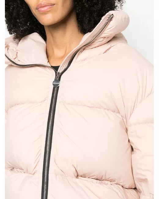 light pink feather down funnel neck slouchy hood front zip fastening long sleeves elasticated cuffs drawstring hem full lining down-feather filling water-repellent finish