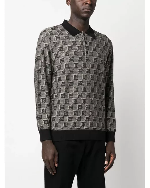 black/grey wool-silk blend jacquard logo motif polo collar front button placket long sleeves contrasting cuffs