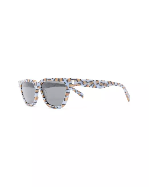 blue marbled pattern cat-eye frame grey tinted lenses curved arms These glasses come with a protective case.