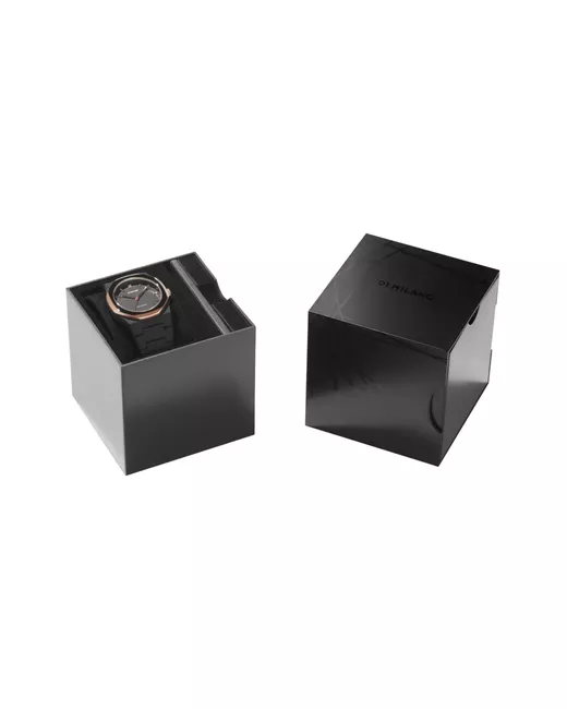 black polycarbonate quartz movement rose gold index dial index hands push-down crown round face mineral glass stainless steel chain bracelet concealed butterfly clasp fastening water resistance up to 500m/50 ATM Your purchase will arrive with a gift box.